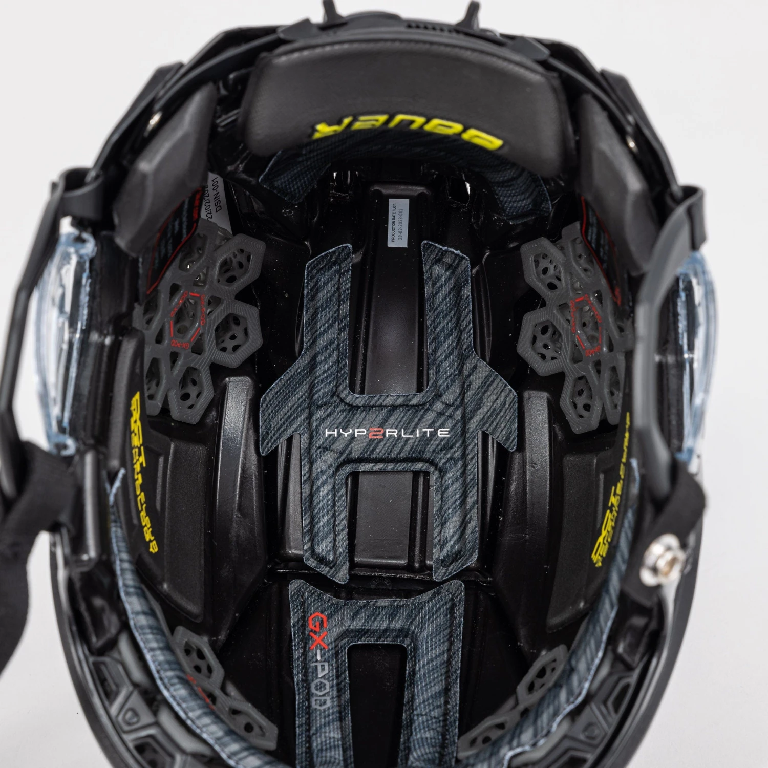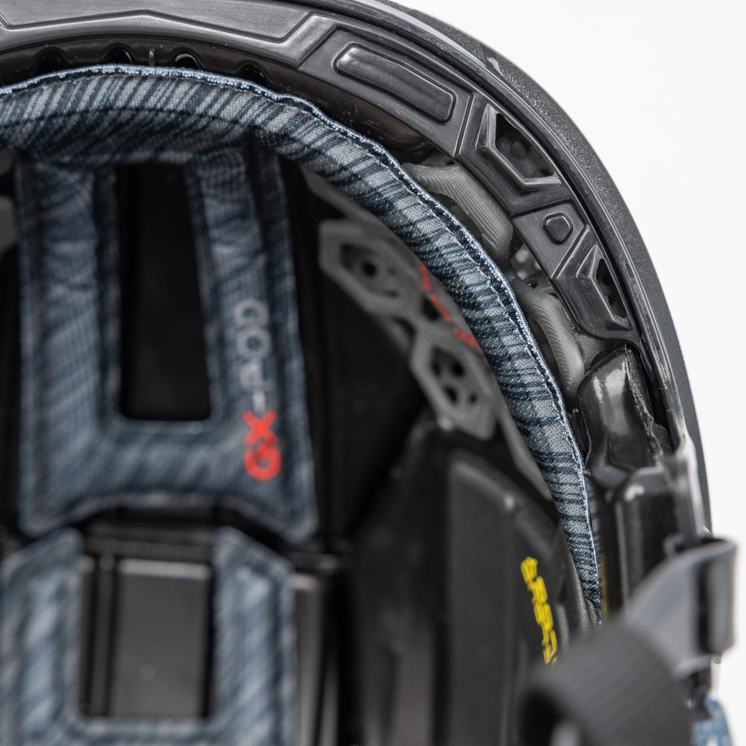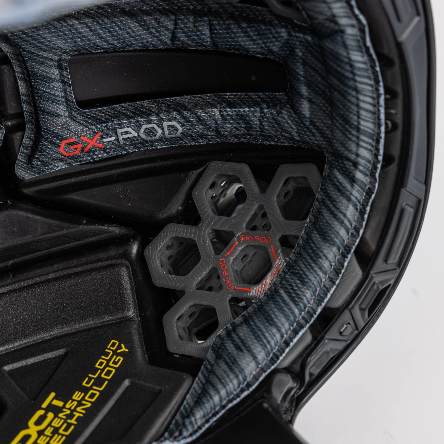 Bauer’s biggest innovation for this helmet lies in the inside of the helmet along the liner. Strategically positioned GX-Cell pods are 3D-printed pods and meticulously designed to maximize energy absorption in areas most prone to impacts, offering unparalleled protection against head injuries. These advanced pods focus on mitigating the force of rotational impacts for better safety on the ice, in addition to featuring integrated air channels for better ventilation.