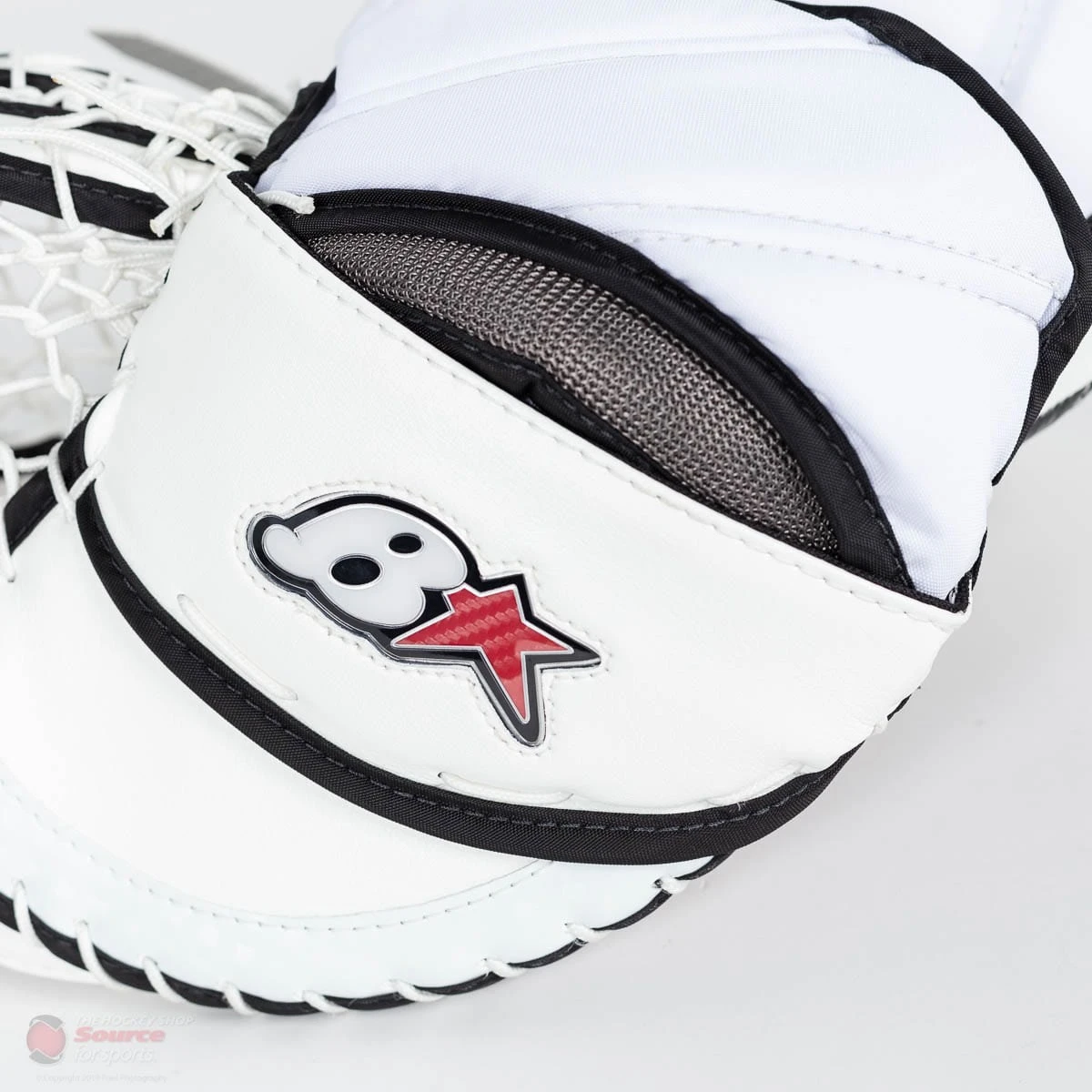 The pocket itself is a double T option that presents a huge surface area to the shooter and helping with puck retention and pop outs. The true one piece design of the trapper ensures that the trapper will not flex and allow the puck to roll into the net if the puck contacts the cuff.