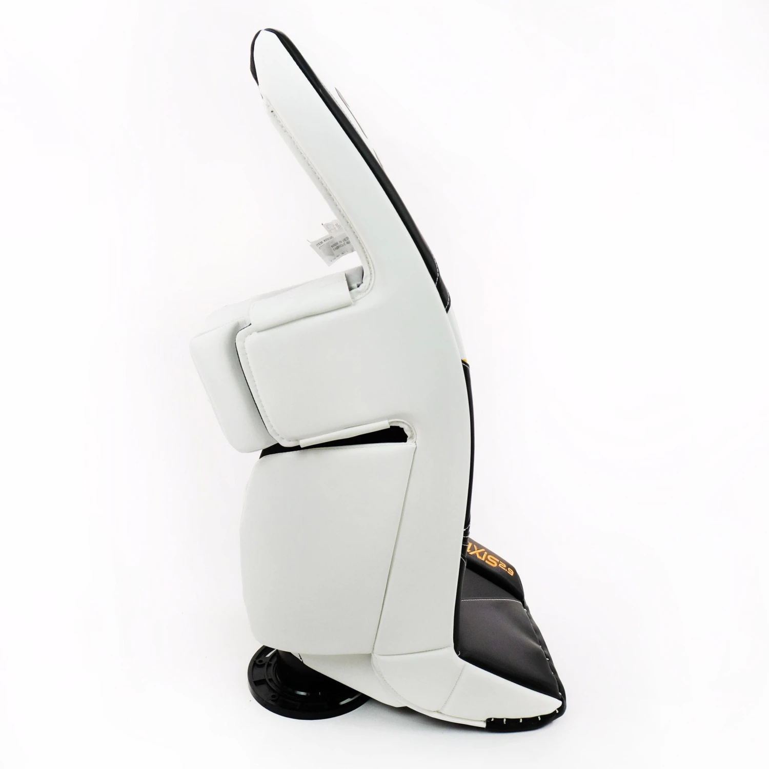 The Axis 2.9 leg pads have a shallow, loose-fit leg channel coupled with their Quick Motion Strap System 2 to offer a comfortable and mobile fit, in addition to keeping you securely strapped in. The Quick Motion Strap System 2 on these pads is optimized specifically and strategically for the butterfly goaltender, so they can easily move and rotate their pads cohesively and in quick response to the play. The toe bridge has been outfitted with bungee toe ties for even better mobility and overall leg support.