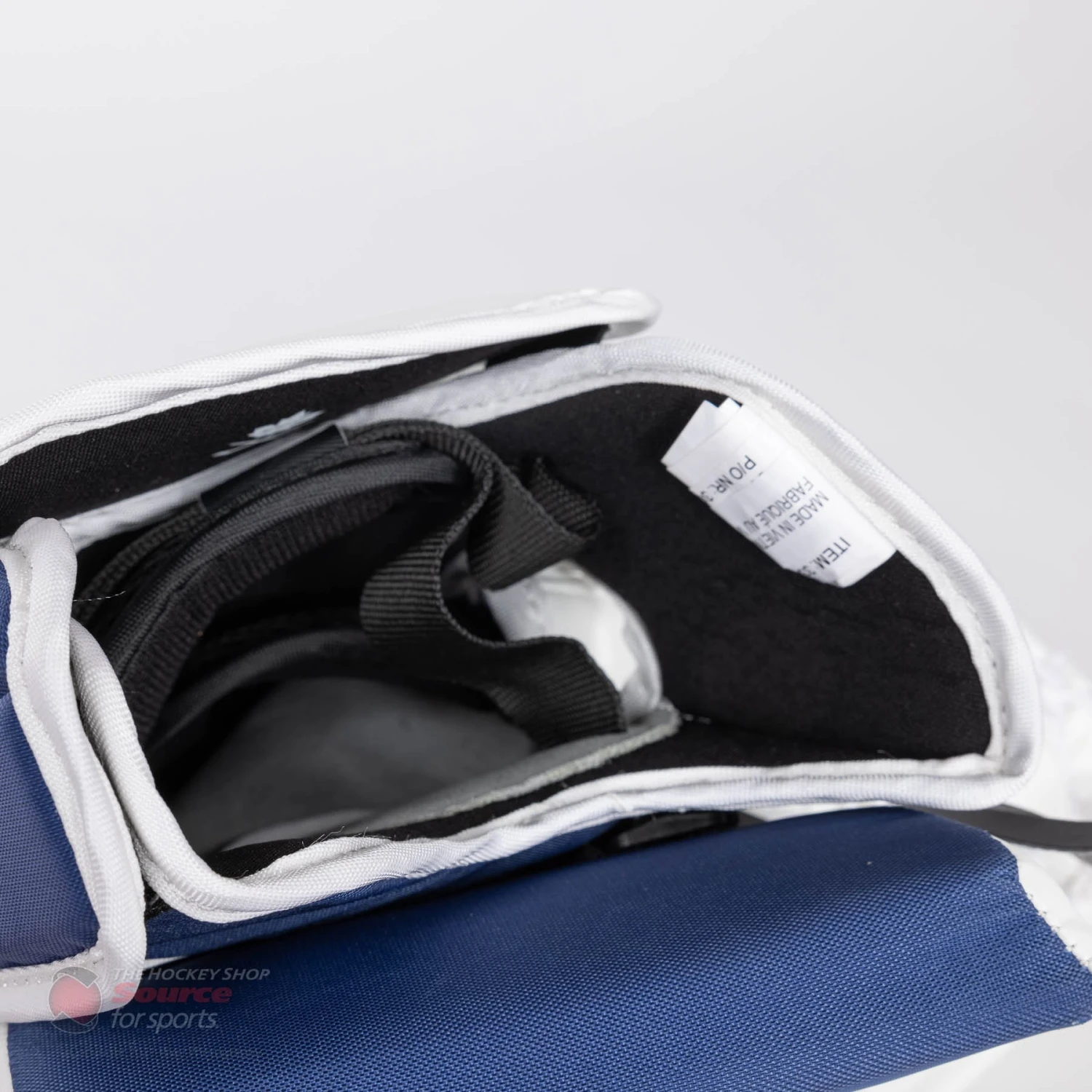 The back hand of the CCM E5.5 catch glove features velcro adjustments for the fingers, as well as the back of the hand. Goalies can also customize their fit by the quick release webbing strap on the wrist, which allows for easy and secure adjustment.