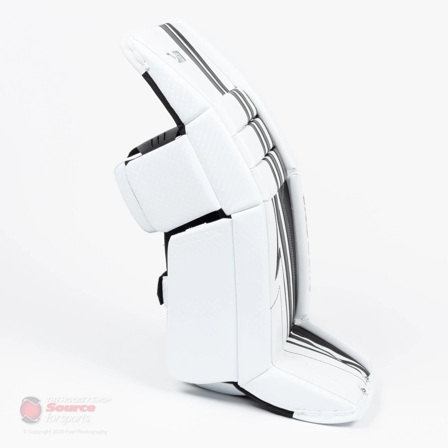 The V9 Int features a redesigned strapping system and calf wrap allowing for a simpler, quicker and lighter system. Vaughn uses a velcro Reactive Rotation Control strap that sits on the upper calf to allow for quicker yet more controlled pad rotation while giving the pad a connected feel. The calf wrap uses a single velcro strap to seal its extended wings that offer better coverage over those of the VE8 shut. While still a fairly tight fitting leg channel, the V9 Int has a widened inner leg cradle overall when compared to previous Velocity pads giving goals the feel of a tight fitting leg channel while offering the better rotation associated with a looser leg channel. Finally, the V9 Int features a velcro bootstrap as well as the same bungee toe tie system seen on the SLR2 leg pads.
