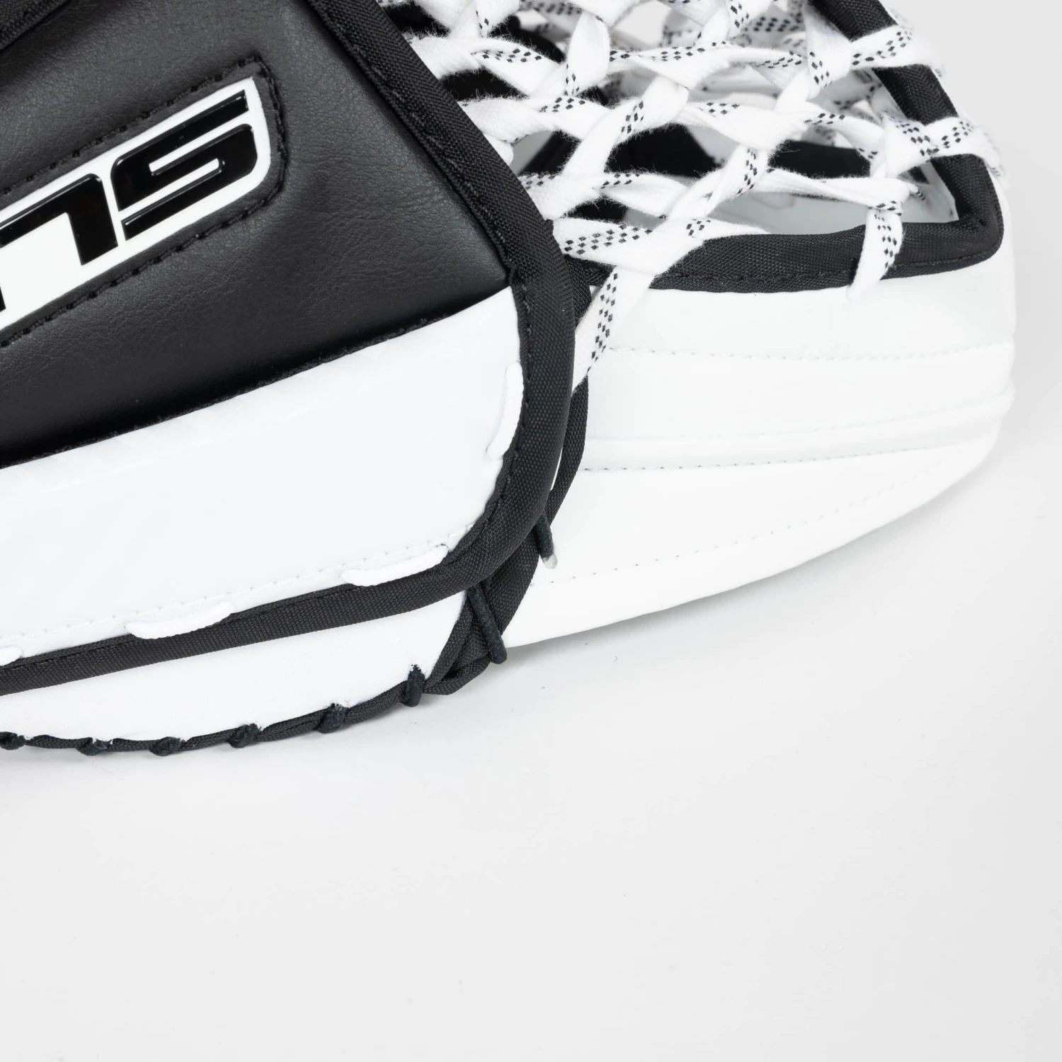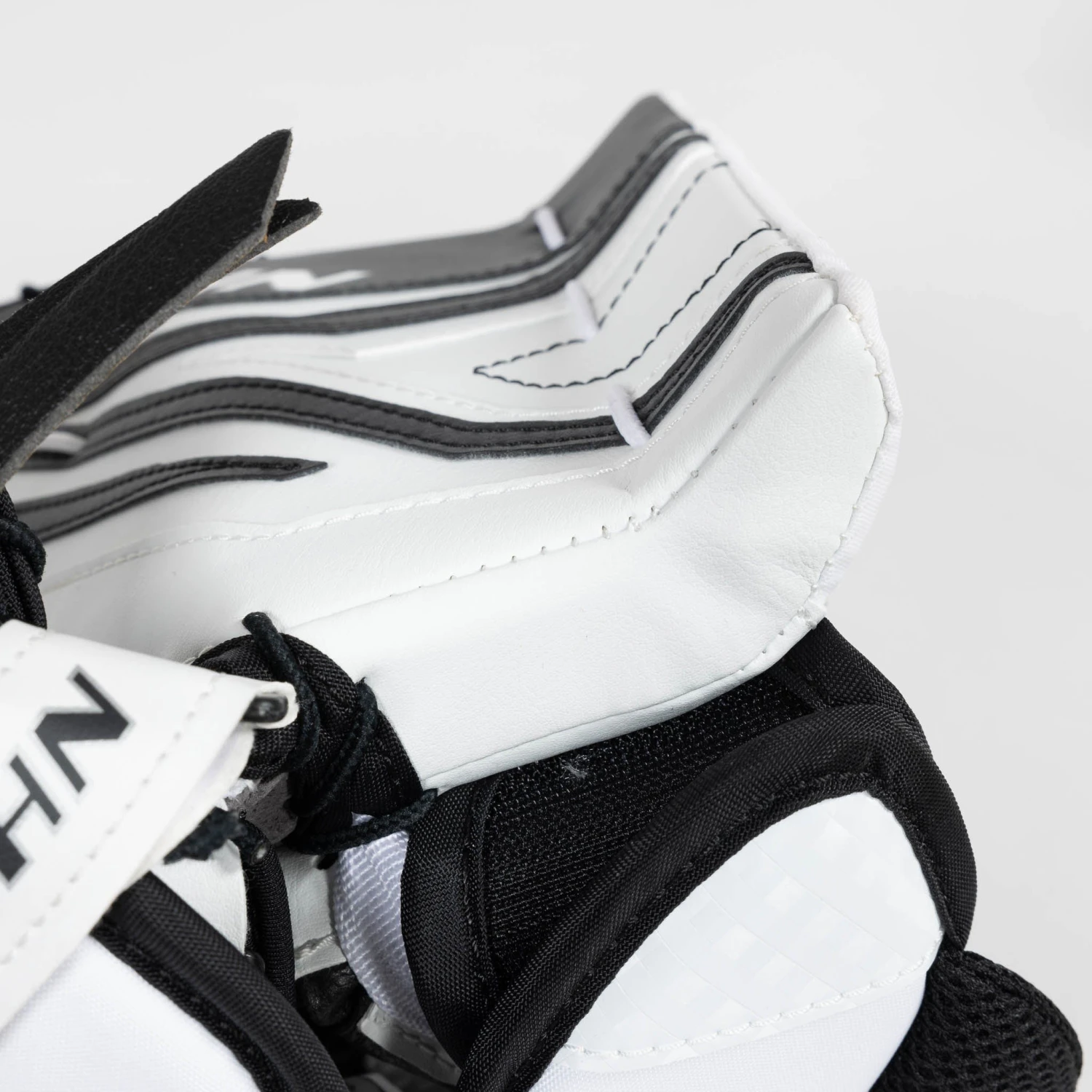 Externally, the glove is made of jenpro synthetic leather, which is a classic choice for goalie equipment due to its durability and effectiveness on the ice. The inner hand uses neoprene synthetic rubber for better glove control and protection. The construction overall has a 39.5” perimeter, making it quite large. Skate laces in the pocket reduce spin on the puck.